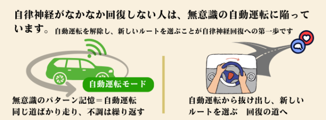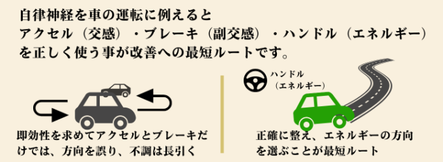 即効性を求めて、アクセル(交感神経)とブレーキ(副交感神経)だけでは、方向を誤り、不調は長引きます。